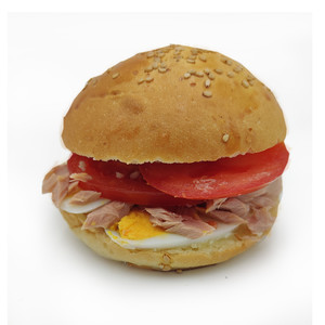 pane al latte con semi di sesamo, uovo sodo, tonno, pomodoro e maionese