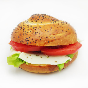 Panino al latte con semi di papavero, insalata, pomodoro, mozzarella, origano e maionese.